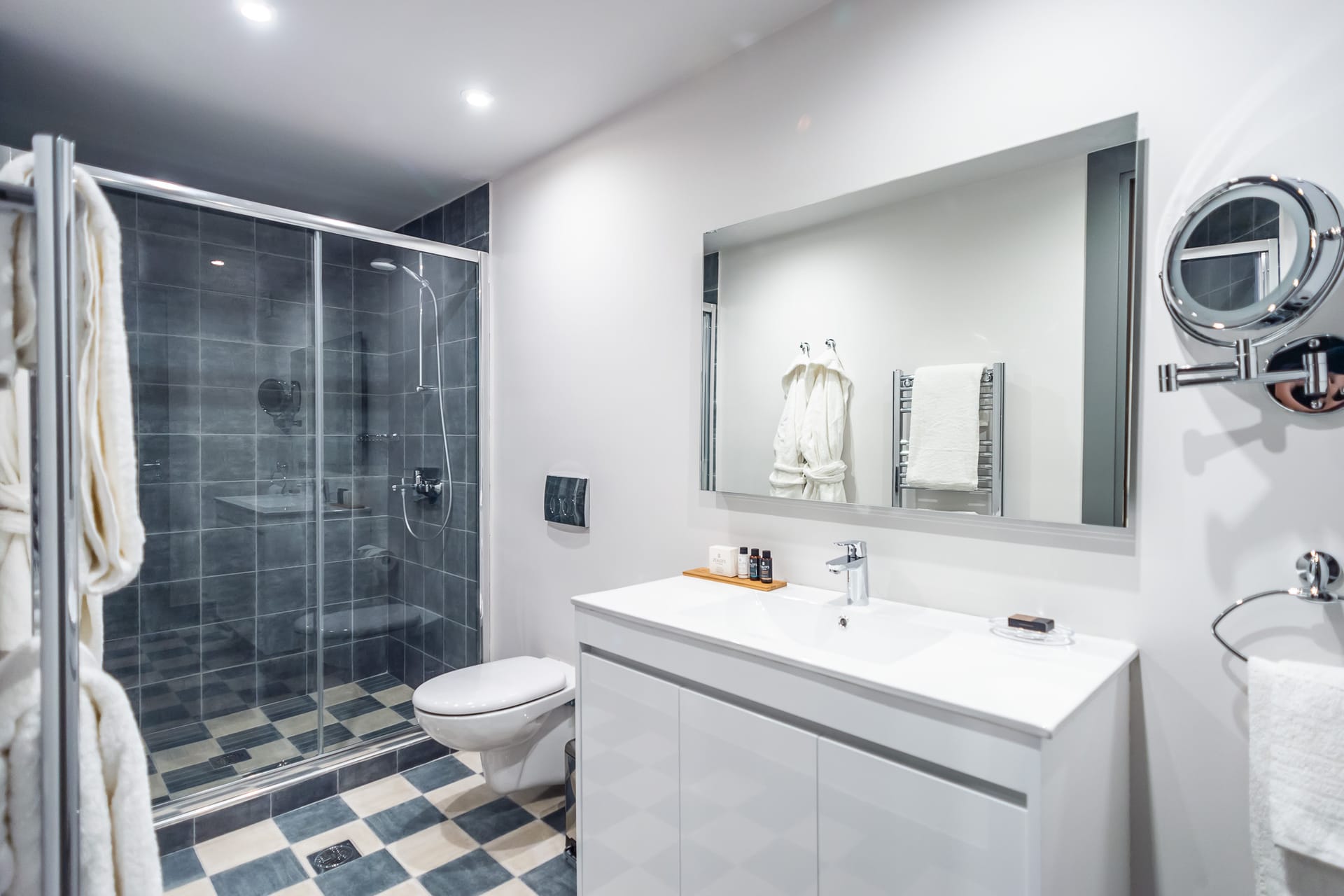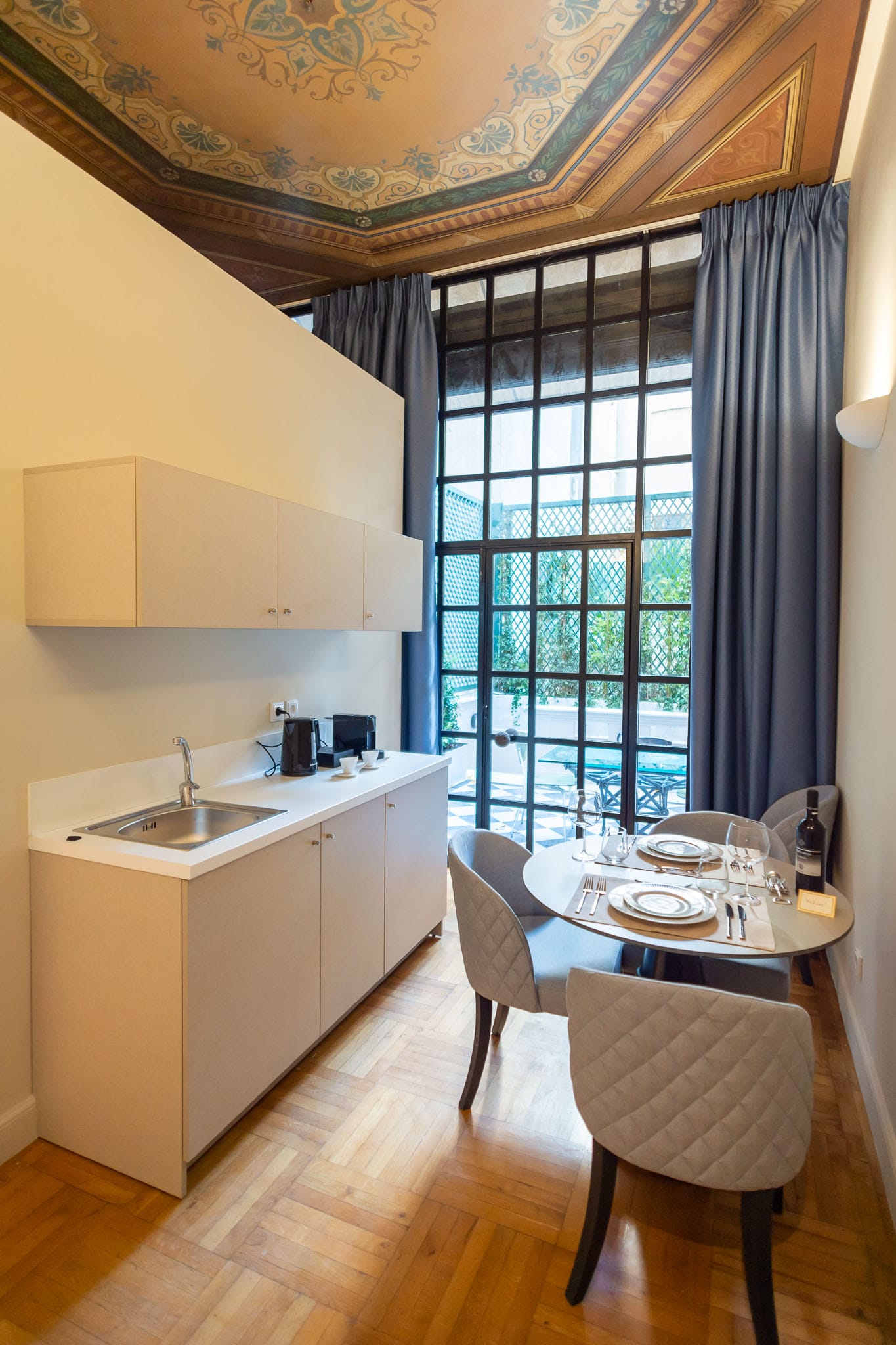 Our Boutique Suite can comfortable accommodate 2 guests and offers city views. It features a queen-size bed, wooden floors and high hand-painted wooden ceilings throughout. The linens in this suite are dressed in comforting and distinct icy grey hues. In the bathroom, aside the double glass-door shower, guests will find a range of branded Zealots of Nature wellness products, a hairdryer and a flat iron. There’s also bespoke furniture, a minibar, a flatscreen TV, and a Bluetooth speaker. The room features a fully equipped kitchenette, an Espresso bar and safety deposit box. All bedrooms come with free Wi-Fi.