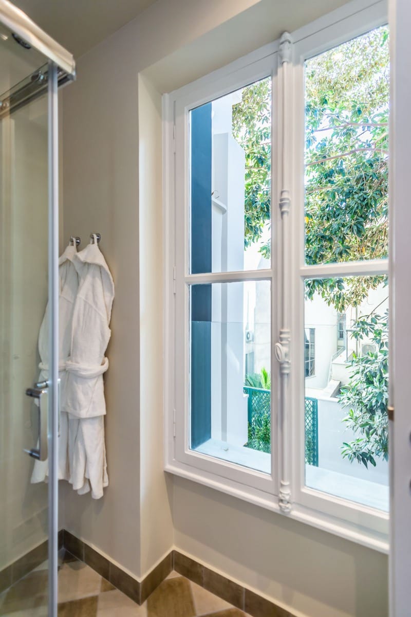 Max: The opulent Luxury Suite can comfortably accommodate 2 guests. It features wooden floors and high hand-painted wooden ceilings throughout, a queen-sized bed with Egyptian cotton coverings which give direct access to the private small balcony, as well as a fully equipped kitchenette. The interiors in this suite are ravishing, reflecting a more classical style, dressed in soothing ice blue and neutral hues. In the bathroom, guests will find a range of branded Zealots of Nature wellness products, a hairdryer, and a flat iron. There’s also bespoke furniture, a minibar, a flat-screen TV, and a Bluetooth speaker. The room features a fully equipped kitchenette, an Espresso bar, and a safety deposit box. All bedrooms come with free Wi-Fi.
