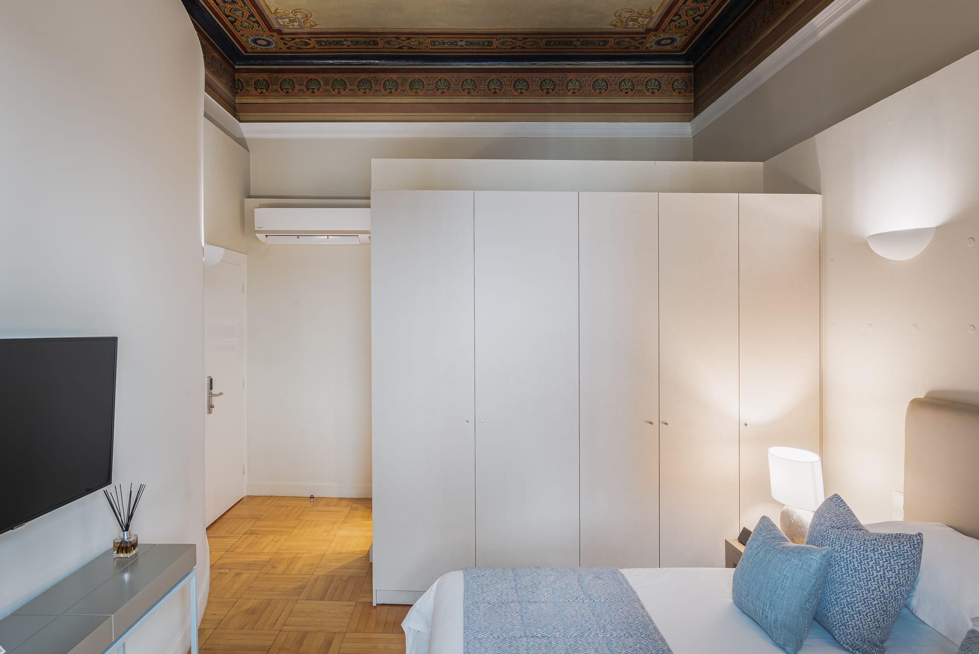 Our Luxury Suite can comfortably accommodate up to 4 guests. It features wooden floors and high hand-painted wooden ceilings throughout, a queen-sized bed with Egyptian cotton coverings dressed in soothing ice blue and pastel hues facing a beautifully made burgundy marble fireplace, as well as a dining corner area and a foldable sofa. The interiors in this suite are ravishing, reflecting a more classical style. In the bathroom, guests will find a spacious glass door shower and a range of branded Zealots of Nature wellness products, a hairdryer, and a flat iron. There’s also bespoke furniture, a minibar, a flat-screen TV, and a Bluetooth speaker. The room features a fully equipped kitchenette, an Espresso bar, and a safety deposit box. All bedrooms come with free Wi-Fi.