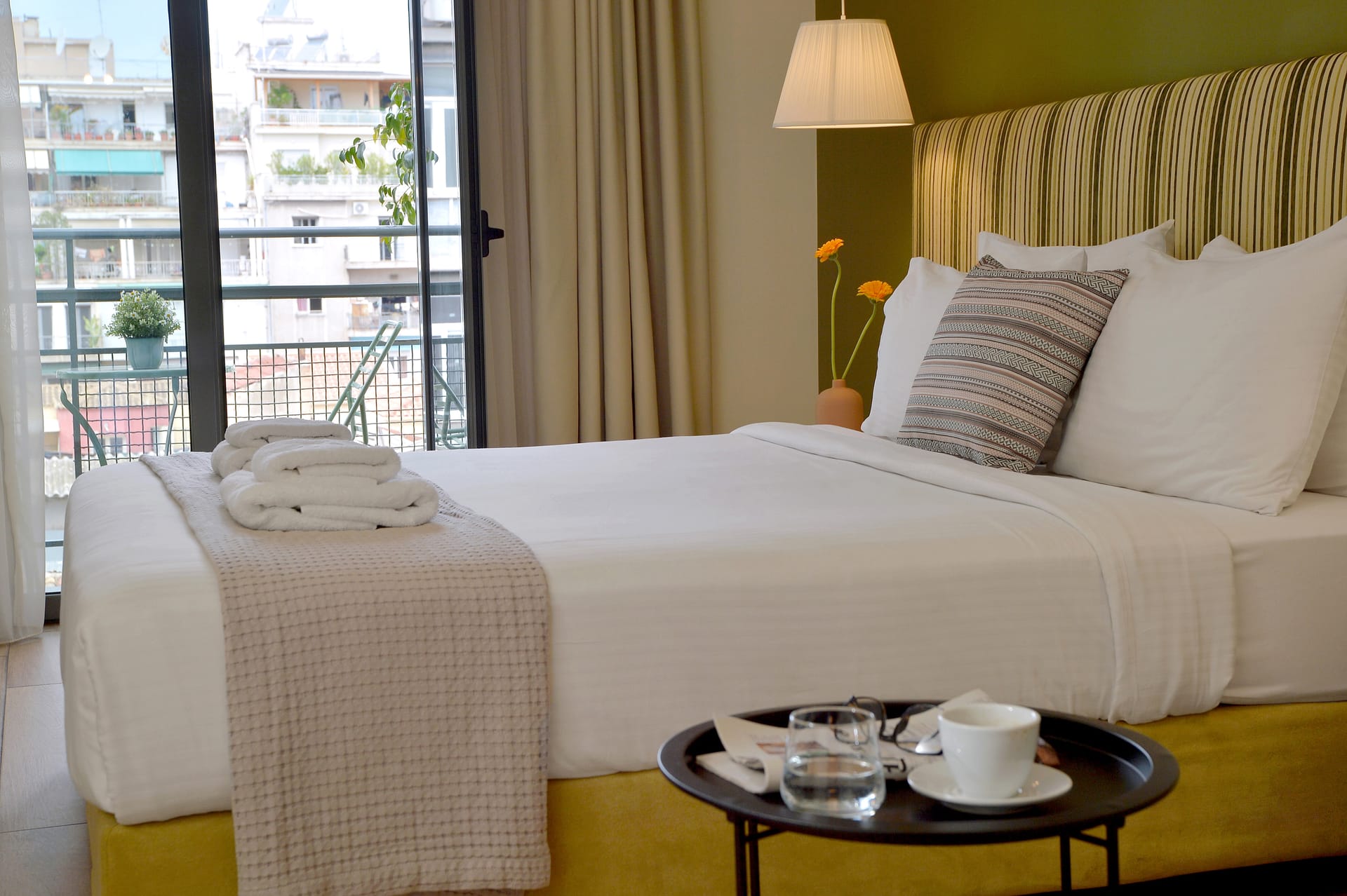 The Divine Athens with Acropolis View & Balcony features earthy colors, high quality modern furnishing, carefully selected fabrics and stunning views over Acropolis Hill. Equipped with a king size bed or twin, a work desk and a modern bathroom with a jet shower walk-in cabin. The Divine Athens with Acropolis View & Balcony has an approximate surface of 40m2 .