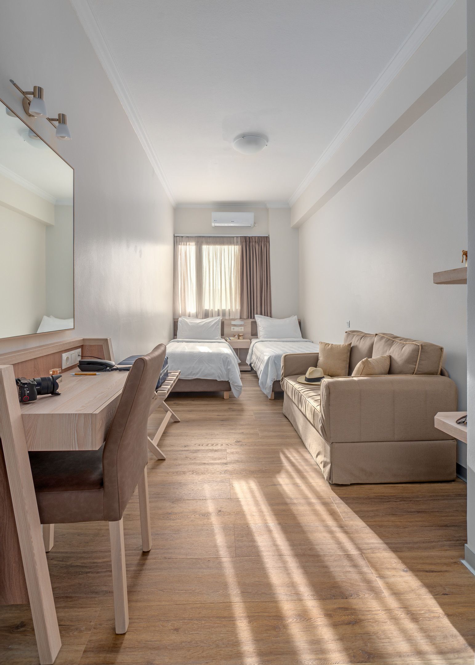 Bed arrangement is either 2 twins plus sofa bed or 1 double plus sofa bed and it is always subject to availability upon arrival.