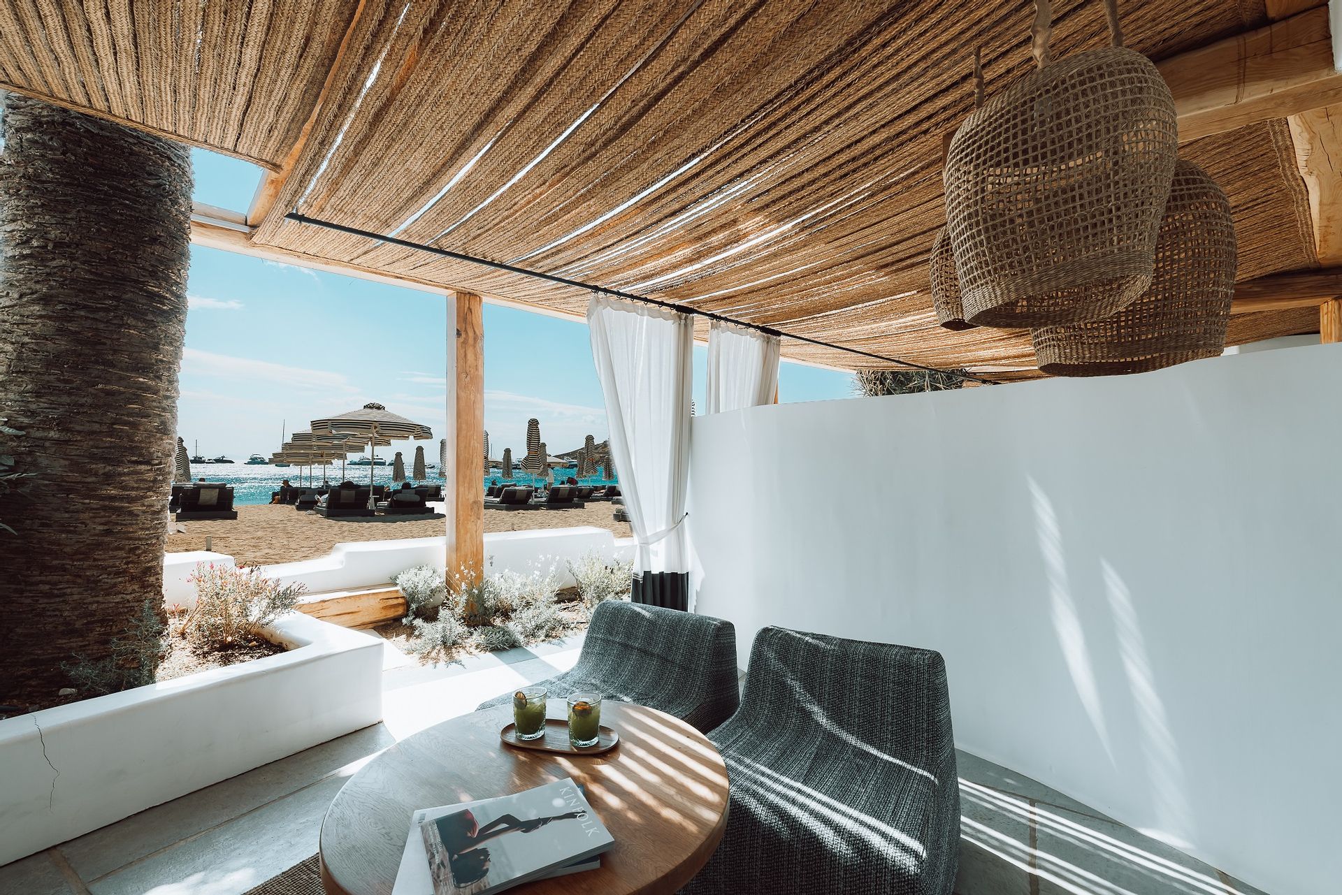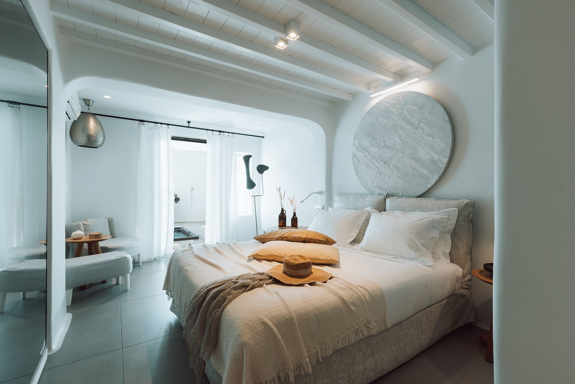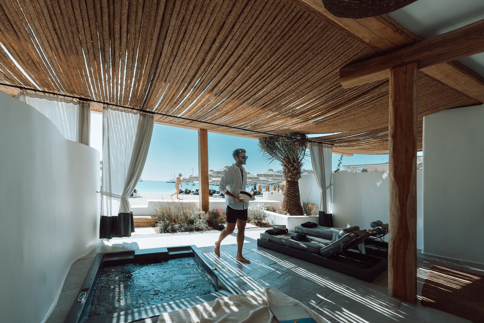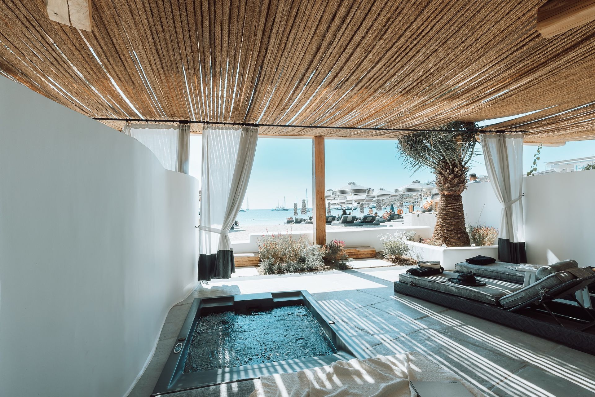 The Ammos Suites offer beachfront experience or unlimited seaview with an outdoor shaded stylish hot tub for ultimate relaxation.The beachfront Ammos Suite with a large veranda leads directly on the white sand of Ornos beach. Minimal aesthetics rule the Ammos Suites decorated with rustic elements matching a summer luxury living experience in Mykonos.