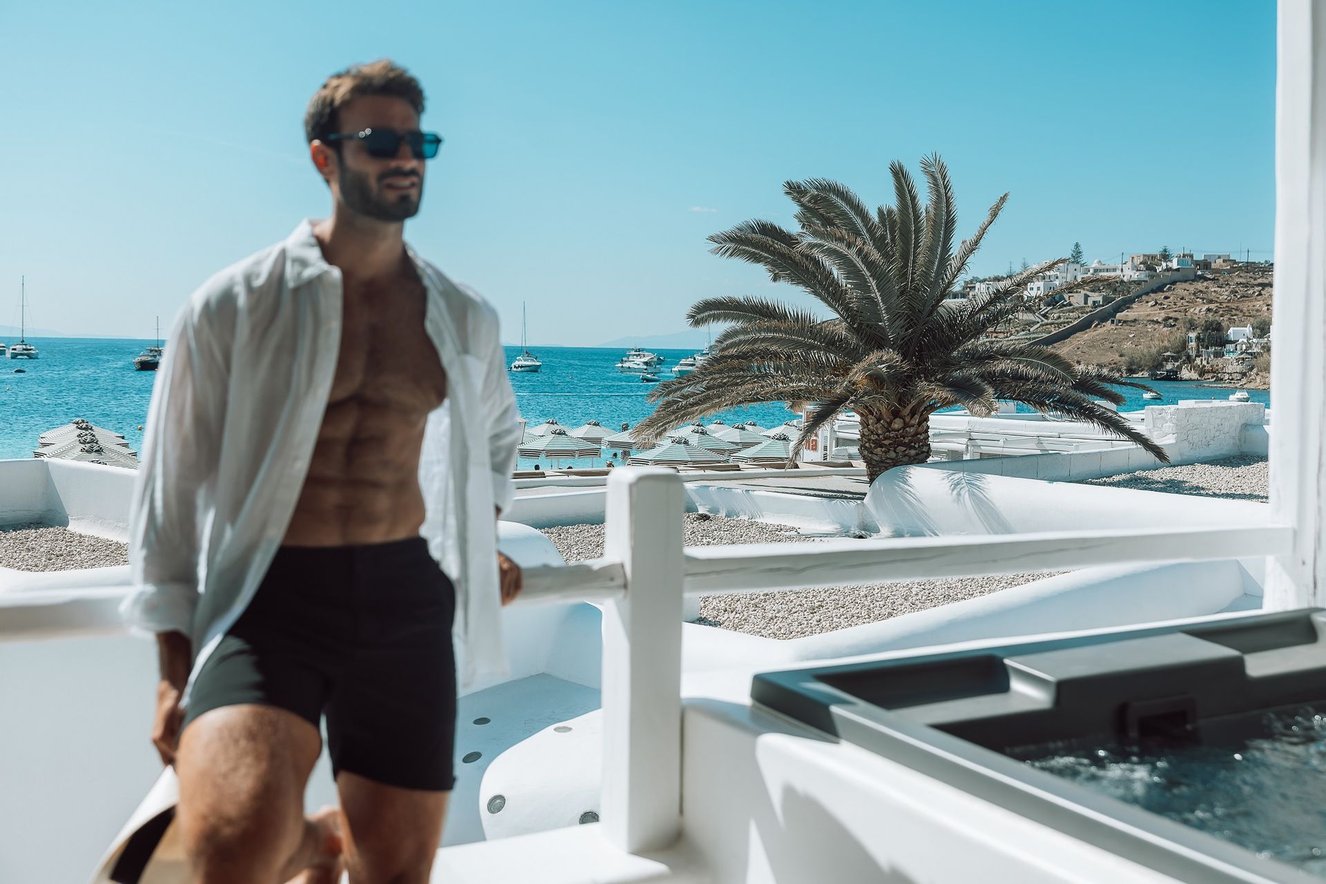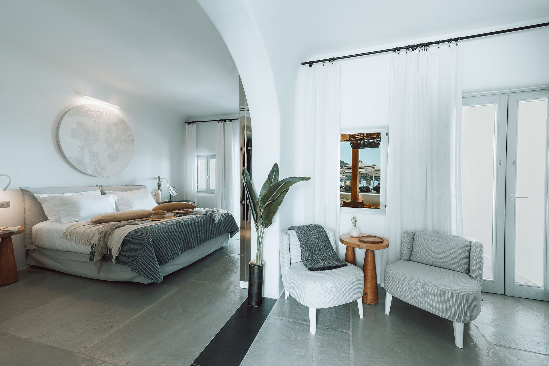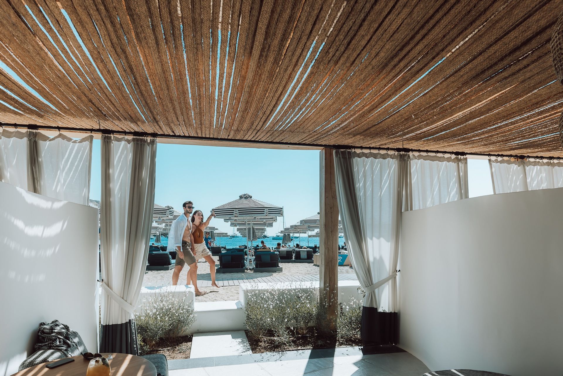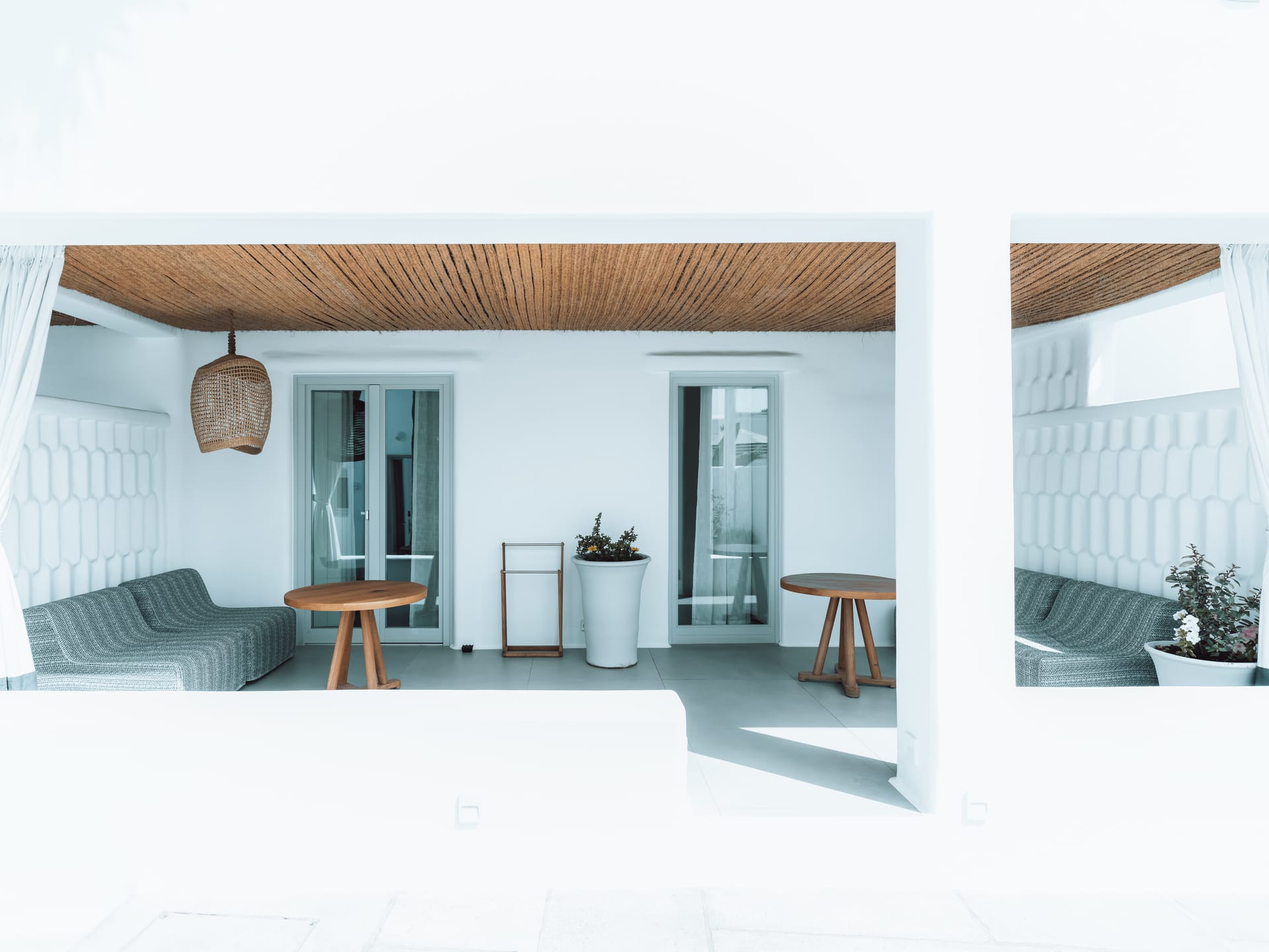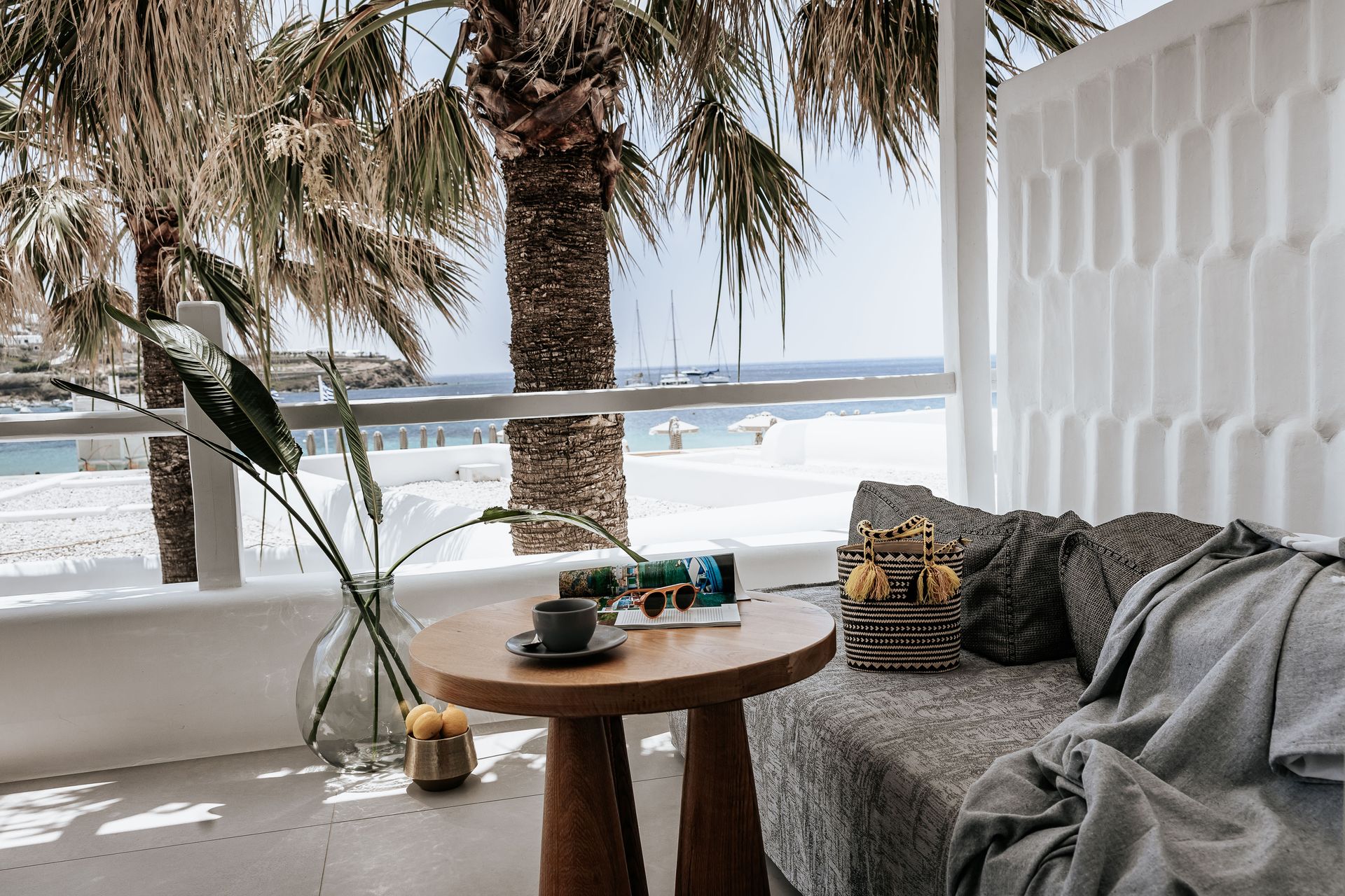 The Ammos Suites offer beachfront experience or unlimited seaview with an outdoor shaded stylish hot tub for ultimate relaxation.The beachfront Ammos Suite with a large veranda leads directly on the white sand of Ornos beach. Minimal aesthetics rule the Ammos Suites decorated with rustic elements matching a summer luxury living experience in Mykonos.