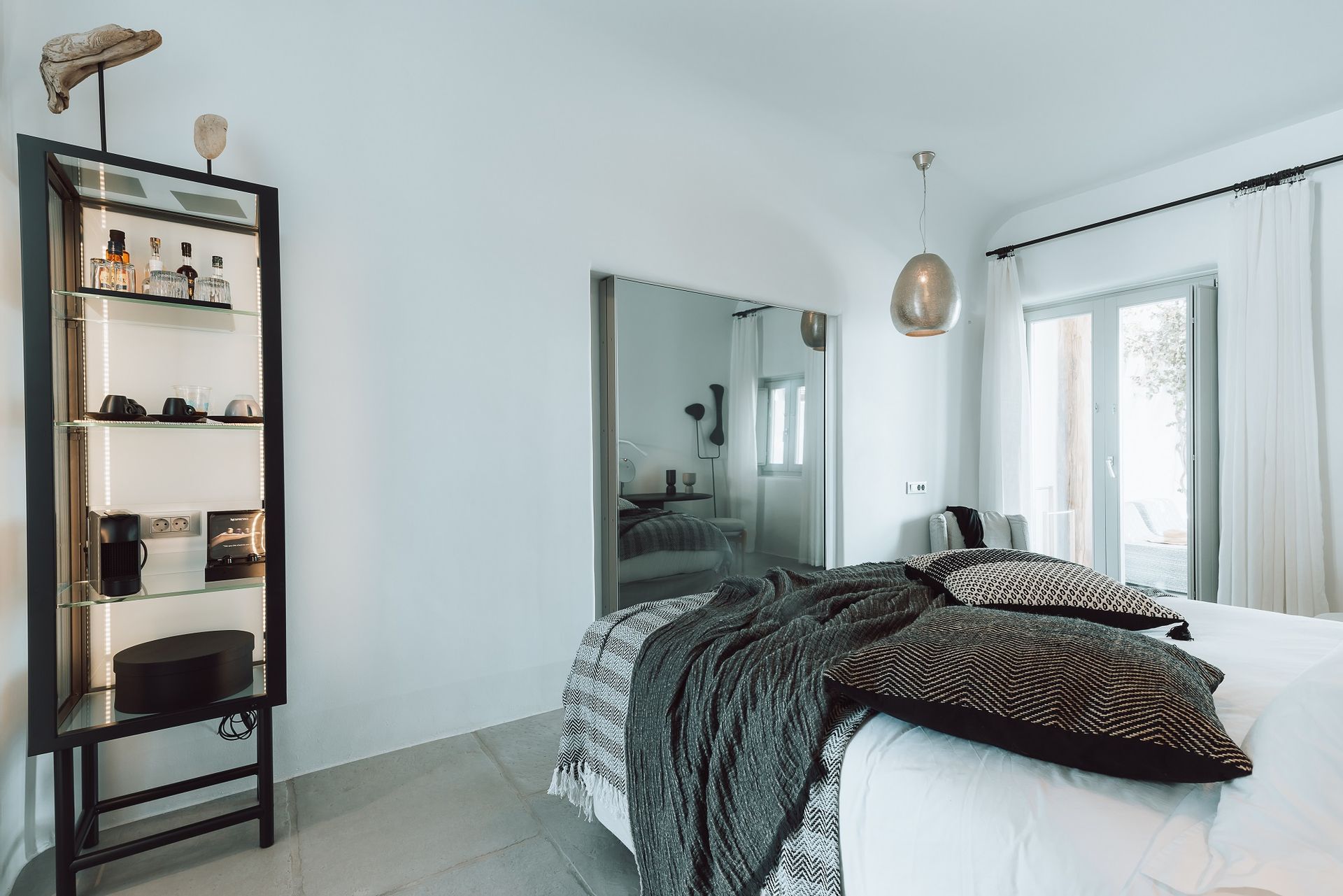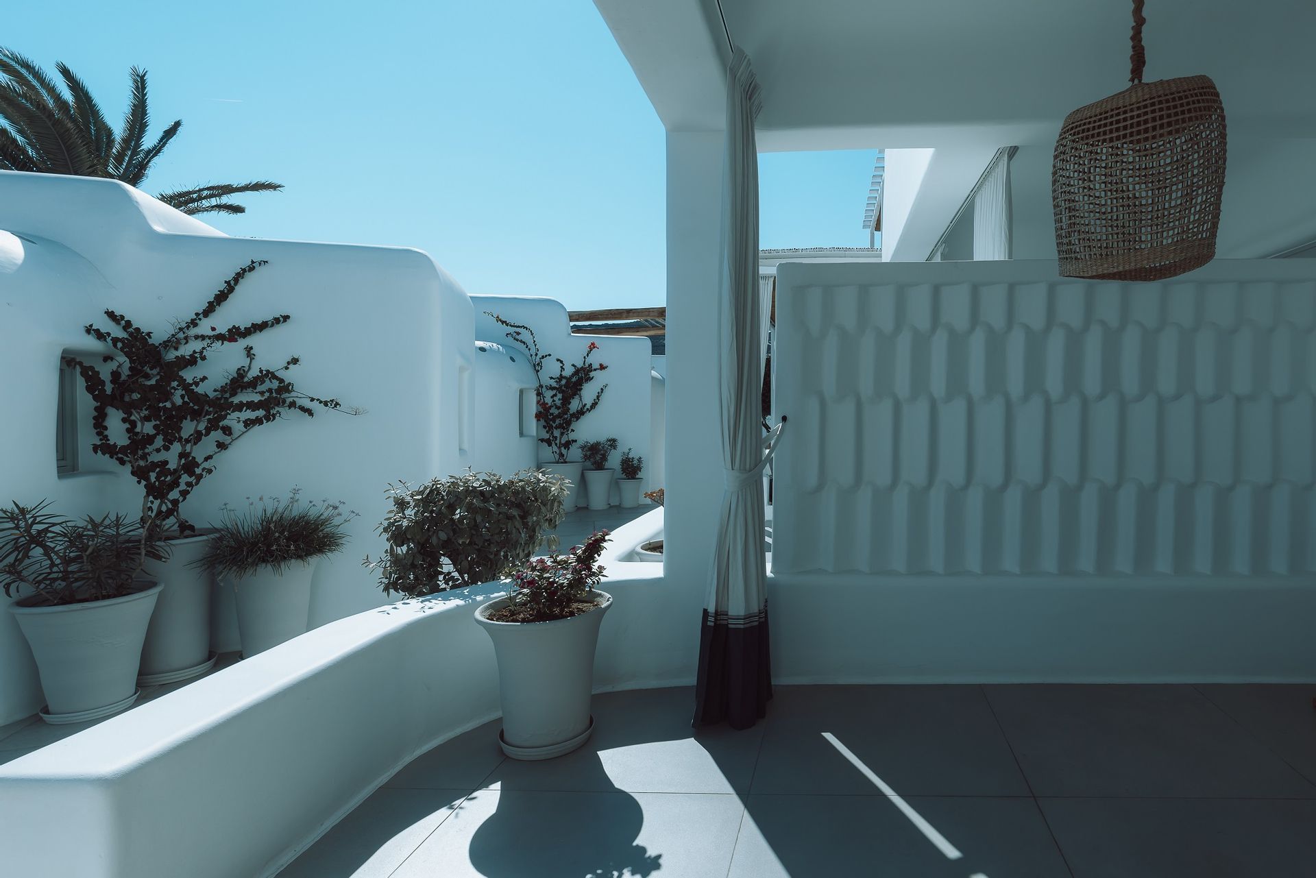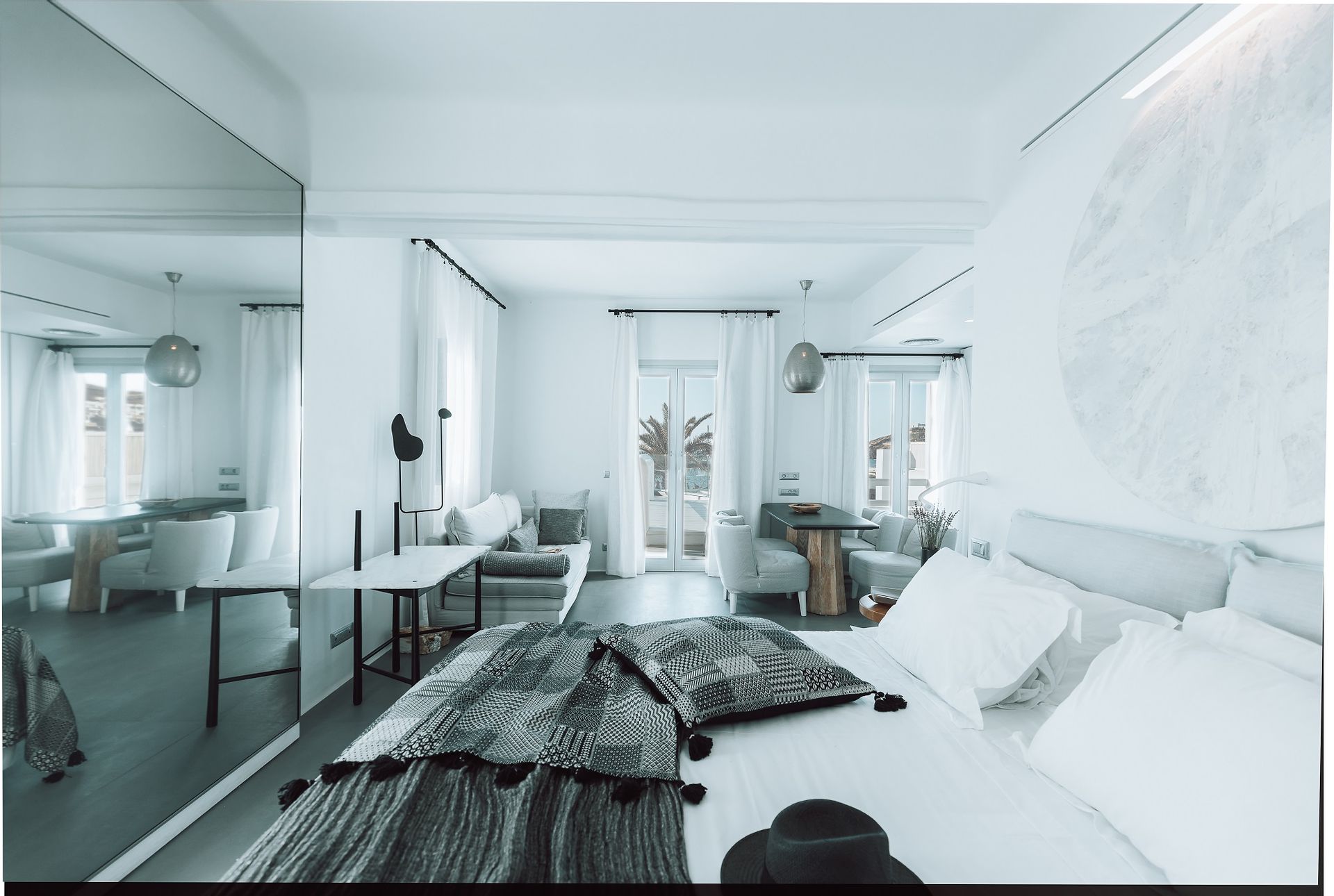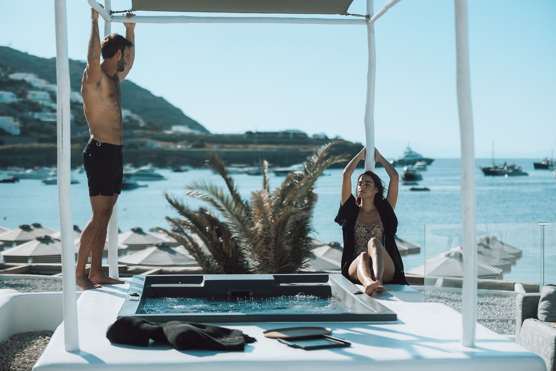 The Ammos Suites offer beachfront experience or unlimited seaview with an outdoor shaded stylish hot tub for ultimate relaxation.The beachfront Ammos Suite with a large veranda leads directly on the white sand of Ornos beach. Minimal aesthetics rule the Ammos Suites decorated with rustic elements matching a summer luxury living experience in Mykonos.