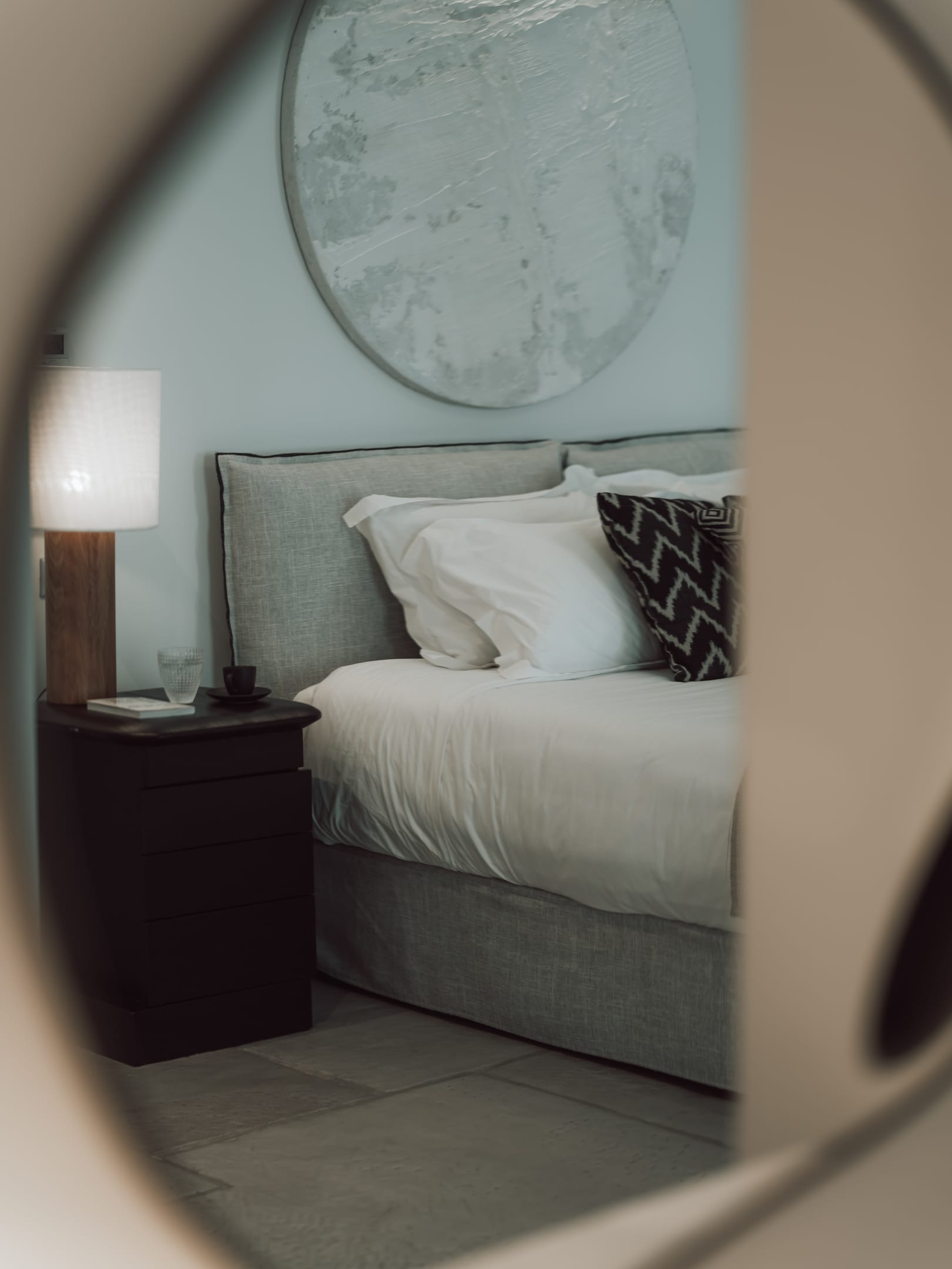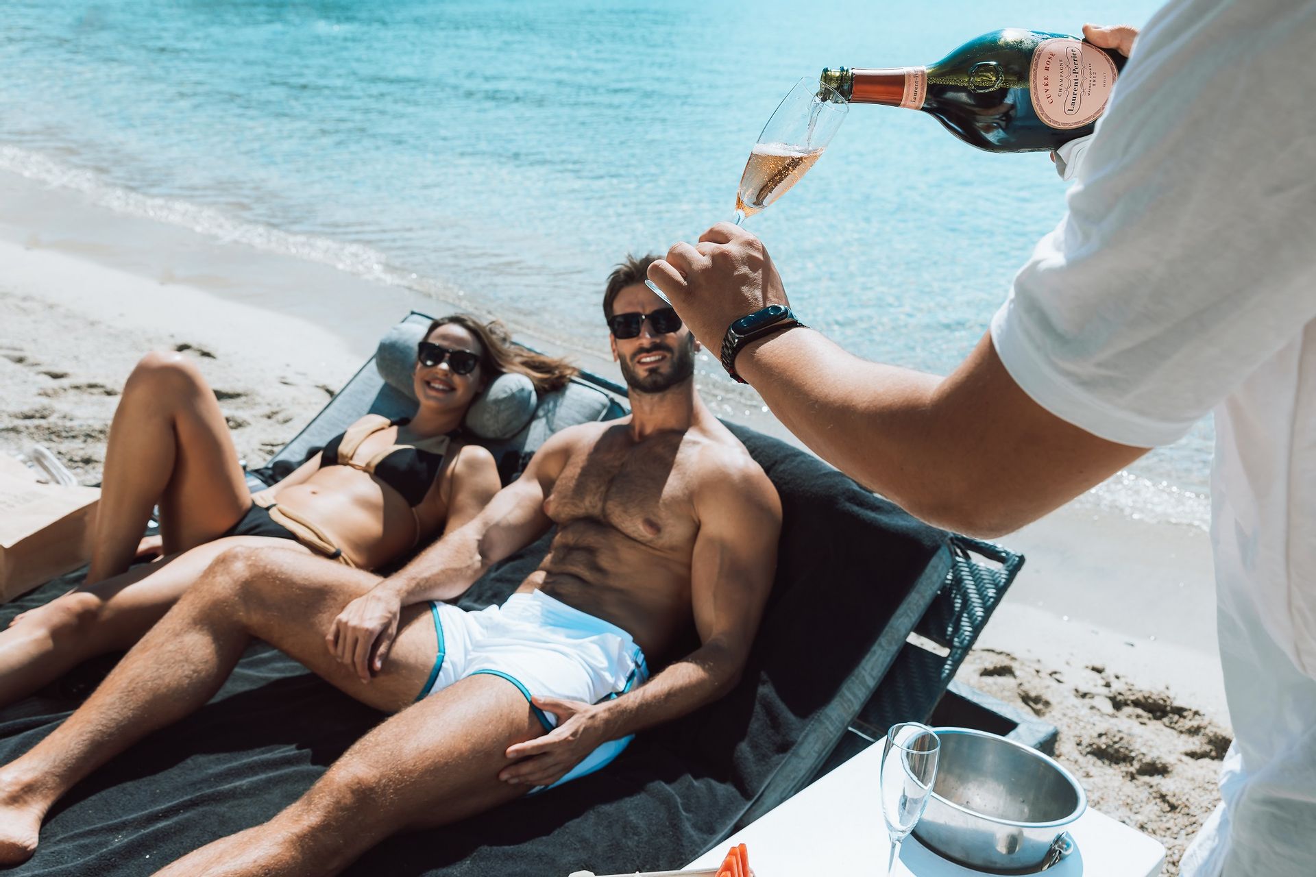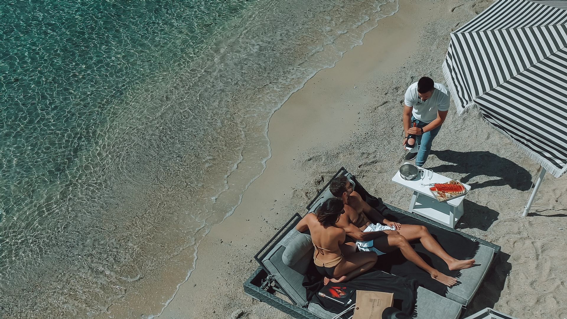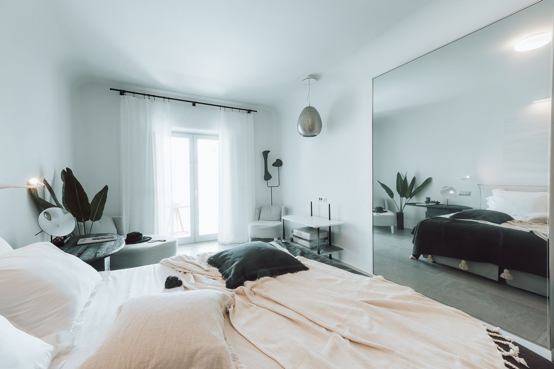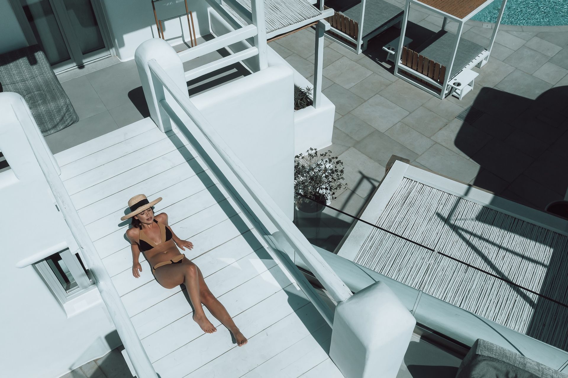 The Ammos Suites offer beachfront experience or unlimited seaview with an outdoor shaded stylish hot tub for ultimate relaxation.The beachfront Ammos Suite with a large veranda leads directly on the white sand of Ornos beach. Minimal aesthetics rule the Ammos Suites decorated with rustic elements matching a summer luxury living experience in Mykonos.