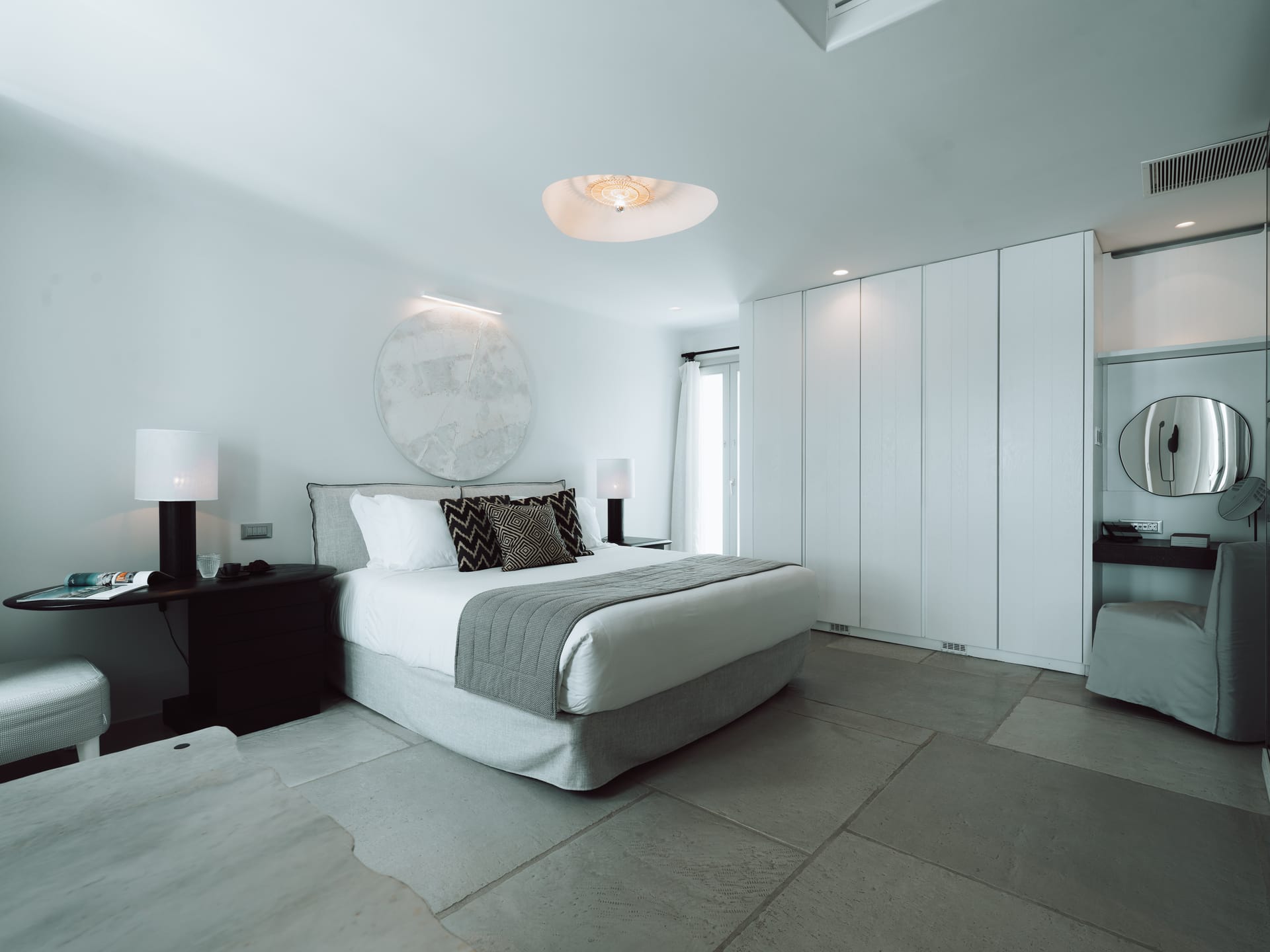 The Standard Ground Suites present a spacious summer living experience in Mykonos. All suites are well equipped with minimal aesthetics and possibilities for alfresco private dining at the secluded verandas and a seaside ambience just a few steps away at the sandy beach of Ornos.